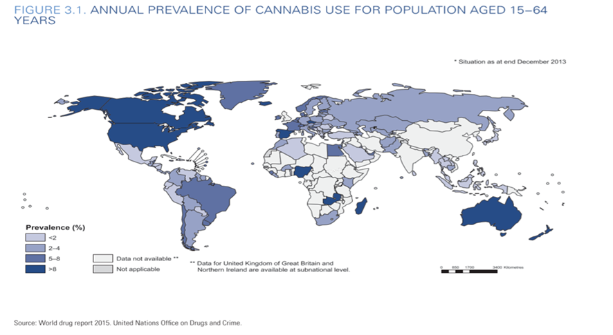 Ker je konoplja v večini delov sveta nezakonita, je nemogoče zbrati natančne podatke o njeni uporabi. Večino informacij se pridobi z vprašalniki, ki temeljijo na reprezentativnem vzorcu znotraj populacije. Podatki, ki jih je Urad Združenih narodov za droge in kriminal izbral v Svetovnem poročilu o drogah iz leta 2015, kažejo, da je letna razširjenost uporabe konoplje največja v Severni Ameriki, Oceaniji, zahodno srednji Afriki ter v nekaterih evropskih državah kot so Češka, Francija, Italija, Španija, Nizozemska in Monako. (1) (2)